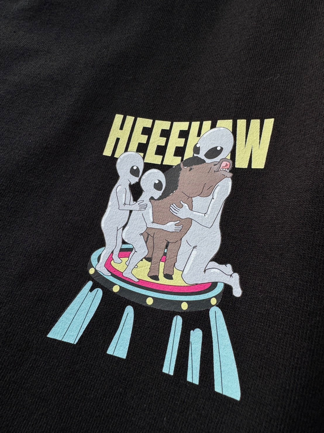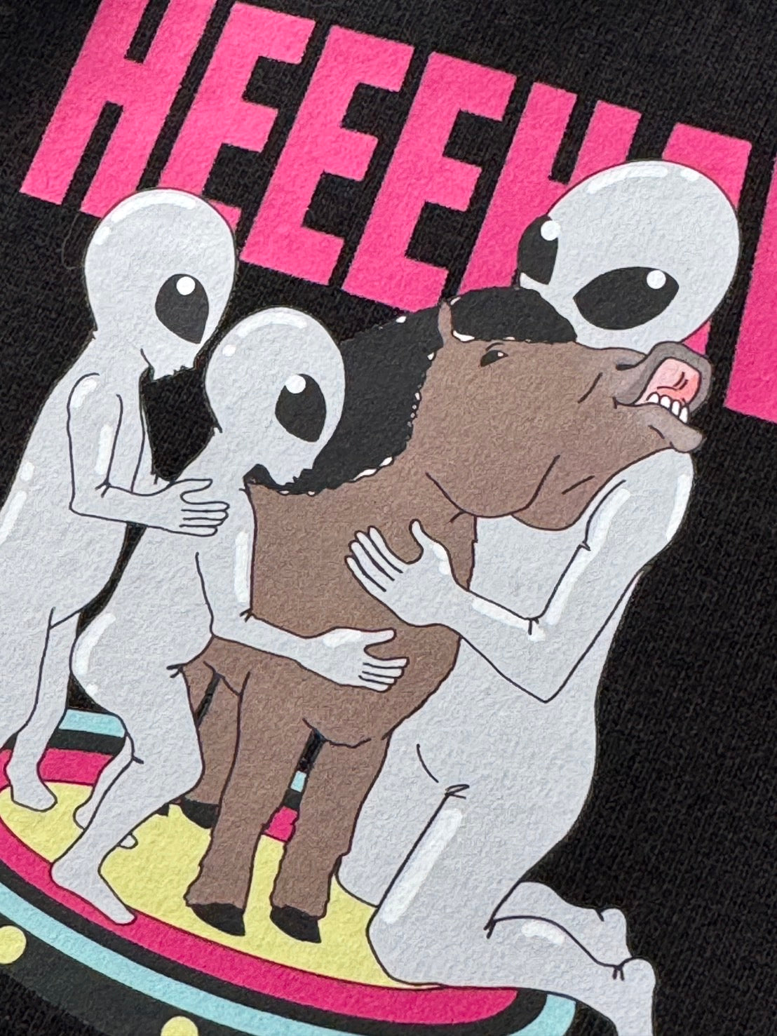SNSで人気の"宇宙人に連れさらわれるミーム"をモチーフに、ぽってりかわいいポニーと宇宙人との不思議な出会いを描いたユニークな1枚。