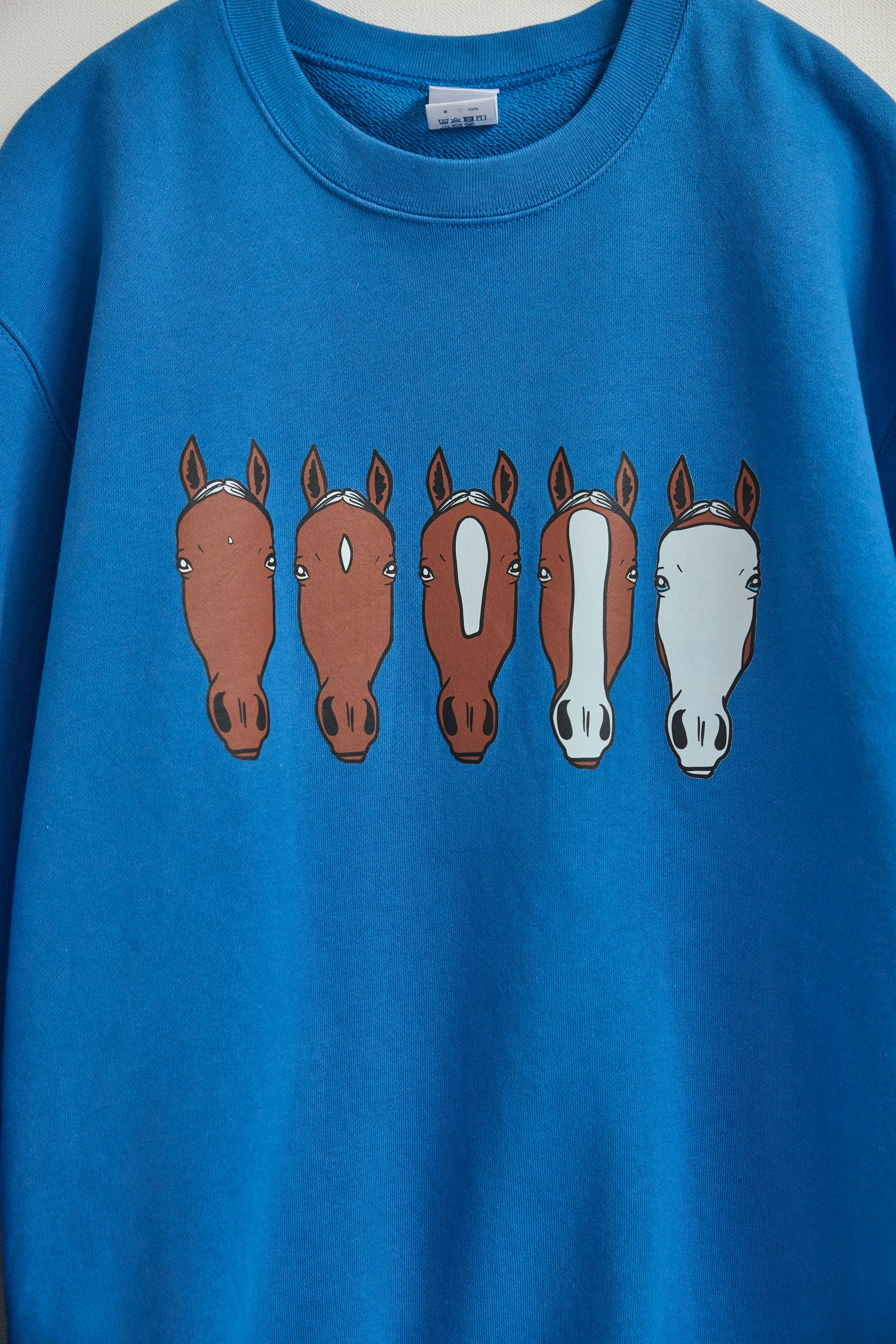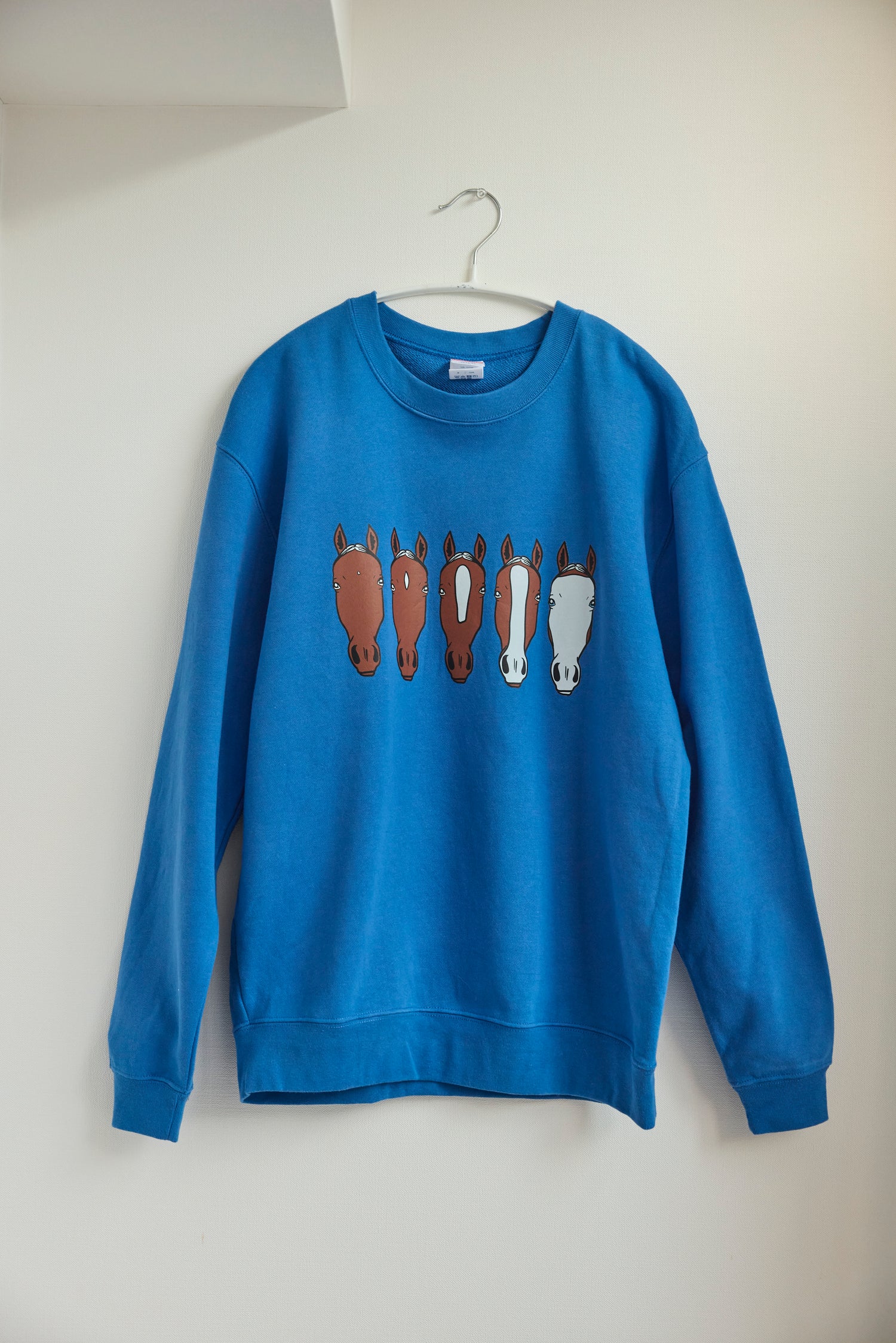 馬の額の模様、『星』・『流星』・『ちょっとのびた流星』・『作』・『白面』を並べてみたシュールかわいいスウェットです。